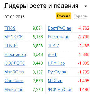 Большой спрос пришелся на "голубые фишки". Увеличили капитализацию акции "Газпрома" (+0,9%) в преддверии "отсечки" 13 мая, "ЛУКОЙЛа" (+1,16%), "Сбербанка" (+2,67%), ВТБ (+2,12%). Также подрастали бумаги некоторых энергетических компаний - ТГК-9 (+9,09%) и "Мосэнергосбыта" (+3,11%). А вот другие представители энергетиков во вторник демонстрировали снижение: "РусГидро" (-1,74%), "ФСК ЕЭС" (-1,47%), "ИНТЕР РАО ЕЭС" (-0,62%). Падали и бумаги НЛМК (-1,89%), МТС (-1,49%).