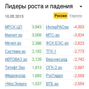 Среди лидеров падения обозначились такие акции как МТС (-3,92%), "ИНТЕР РАО ЕЭС" (-4%), "РусГидро" (-2,56%), "ФСК ЕЭС" (-2,82%), ВТБ (-2,55%). Положительная динамика наблюдалась в акциях "МРСК Центра и Приволжья" (+3,94%), "Мечела" (+2,39%), "Магнита" (+3%), "АВТОВАЗа" (+2,12%). Во второй половине дня Московская биржа приостанавливала торги обыкновенными акциями "МРСК Урала" на 30 минут в связи с ростом котировок более чем на 20% по сравнению с ценой закрытия предыдущего торгового дня.