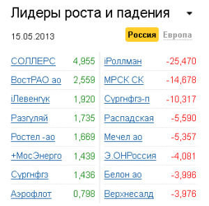 Лучше рынка в среду торговались акции "СОЛЛЕРСа" (+4,955%), поводом для повышенной активности в бумагах автопроизводителя стали сообщения о планах по расширению его бизнеса. В лидерах торгов также отметились бумаги ряда компаний энергетического сектора - "РАО ЭС Востока" (+2,559%), "Мосэнерго" (+1,4%), а также "Ростелеком" (+1,67%) и "обычка" "Сургутнефтегаза" (+1,4%). Тем временем, привилегированные акции компании после вчерашней "отсечки" по итогам дня потеряли больше 10%. "Очевидно, что текущая просадка привилегированных акций "Сургутнефтегаза" является чрезмерной, хотя точный размер дивидендов еще не известен. Вероятно, в результате значительного падения величины чистой прибыли "Сургутнефтегаза" по РСБУ в 2012 году размер дивидендов будет ниже выплаченных за 2011 год 0,6 рубля на обыкновенную и 2,15 рубля на привилегированную акцию", - считает Виталий Манжос из "Норд-Капитала".
