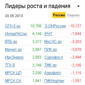 В лидерах повышения оказались также бумаги ВТБ (+3,3%), чему поспособствовала новость о покупке сербской "дочки" "Банка Москвы", а также неплохая отчетность за четыре месяца 2013 года по РСБУ. Аналитики ГК "Альпари" вновь предлагают обратить внимание на акции "Газпрома" (+0,7%), поскольку 21 мая совет директоров компании объявит размер дивидендов за 2012 год. "Изначально "Газпром" планировал направить на выплаты акционерам 25% от чистой прибыли или 5,99 рубля на акцию. Перечислять на дивиденды четверть прибыли государственные компании обязало правительство. Однако в последнее время чиновники спорят, нужно ли еще увеличить эти суммы. Минфин предлагает довести выплаты до 35% от чистой прибыли по МСФО. Минэкономразвития выступает против", - комментируют эксперты.