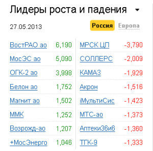 В аутсайдерах торгов, помимо "КАМАЗа" и "СОЛЛЕРСа", оказались в понедельник "МРСК Центра и Приволжья" (-3,79%), "Акрон" (-1,52%), МТС (-1,37%), "Аптечная сеть 36,6" (-1,36%). В "зеленой зоне" удалось финишировать бумагам "РАО ЭС Востока" (+6,19%), "Мосэнергосбыта" (+5,09%), ОГК-2 (+4%), "Магнита" (+1,5%) и ММК (+1,25%).