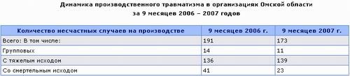 По данным государственной инспекции труда в Омской области за 9 месяцев 2007 года в организациях на территории региона зарегистрировано 173 несчастных случая на производстве, в том числе 11 – групповых, 23 – со смертельным исходом и 139 – тяжелых. В результате несчастных случаев погибли 28 человек и получили тяжелые увечья 148 человек, в том числе - 27 женщин. Стоит отметить, что за весь 2006 год увечья на производстве получили 24 женщины.