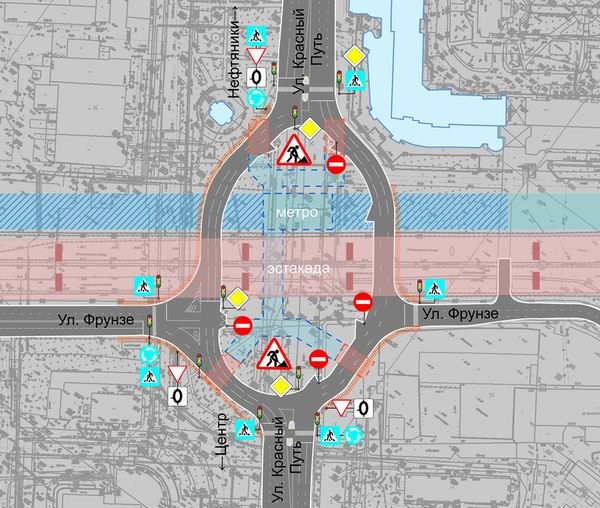По информации НПО "Мостовик", сейчас подготовлено основание временного кольца, уложены железобетонные плиты проезжей части, с двух сторон смонтировано ограждение дороги, устроены пешеходные проходы, смонтированы опоры контактной сети, проведены работы по устройству примыканий к действующим автомобильным дорогам Красный Путь и Фрунзе, установлены светофоры. Для завершения всех работ по устройству временной кольцевой развязки и перевода движения на временную схему с 4 по 6 марта будет закрыто движение по улицам Красный Путь – Фрунзе.