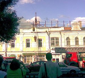 Вечером 17 июля на пульт дежурного МЧС поступило сообщение о пожаре на чердаке двухэтажного дома по улице Ленина, в котором расположены офисы и магазины. По данным пресс-службы управления пожарной охраны, возгорание возникло в чердачном помещении кирпичного здания 1890 года постройки, размером 15х20 метров. Предполагаемой причиной пожара называют "нарушение правил технической эксплуатации электрооборудования" - короткое замыкание электропроводки. В тушении пожара участвовали 10 пожарных автомобилей и 1 автомобиль оперативного реагирования. На момент прибытия пожарных горела кровля на площади 30 квадратных метров. Для разбора конструкций крыши пожарным пришлось применить дисковую электрическую пилу. Огонь был локализован в 20:18, возгорание ликвидировано в 20:50. Оценкой ущерба занимаются эксперты.