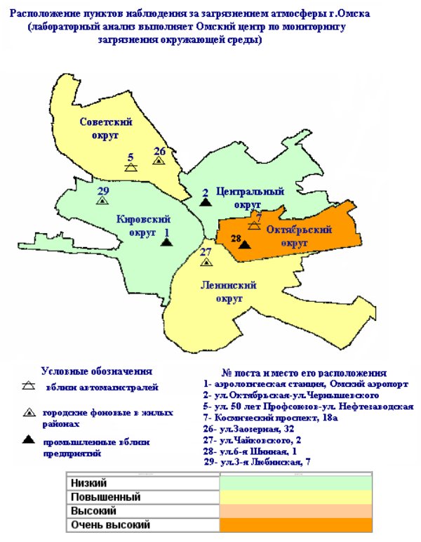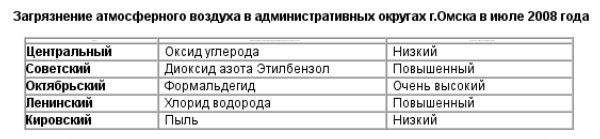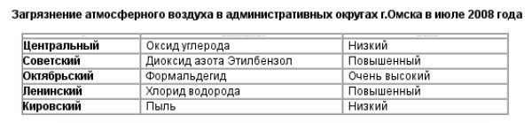 По сведениям ГУ "Омский центр по гидрометеорологии и мониторингу окружающей среды с региональными функциями", в июле 2008 года в целом по городу уровень загрязнения воздуха был очень высоким. 23 июля на посту №28 в Октябрьском административном округе зарегистрирован случай высокого загрязнения атмосферного воздуха формальдегидом (13,7 ПДК). В Советском и Ленинском округах весь месяц уровень загрязненности воздуха продержался на отметке "повышенный". А в Кировском и Центральном загрязнение атмосферного воздуха удалось снизить до отметки "низкий".
