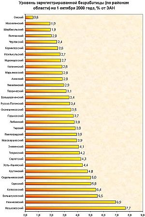 По итогам девяти месяцев уровень безработицы в Омской области составил 1,3% экономически активного населения. В период с января по сентябрь 2008 года официально признаны безработными 23,8 тысячи человек из 53586 граждан, ищущих работу и зарегистрированных в службе занятости.