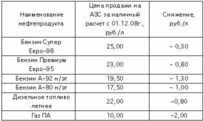 Как сообщает пресс-служба ОАО "Газпром нефть", с 1 декабря 2008 года компания снижает оптовые и розничные цены на нефтепродукты. Представители компании объясняют это, уже четвертое с начала августа, снижение падением цен на нефть на мировом рынке.