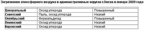 По информации ГУ "Омский центр по гидрометеорологии и мониторингу окружающей среды с региональными функциями", в январе 2009 года в целом по городу уровень загрязнения воздуха был повышенным. Выше допустимого в Омске оказалось содержание в атмосфере Омска оксида углерода и формальдегида. Низкое содержание оксида углерода преобладало в воздухе Кировского, Ленинского и Советского округах. В последнем обнаружена еще пыль. В Октябрьском и Центральном зарегистрирован повышенный уровень формальдегида и оксида углерода соответственно.