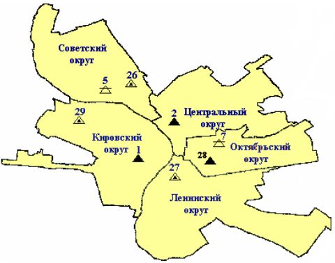 Расположение пунктов наблюдения за загрязнением атмосферы г. Омска