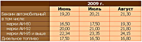 Дизельное топливо с июня по август даже подешевело - с 17 рублей 50 копеек за литр до 16 рублей 80 копеек, а в июле оно и вовсе стоило 16 рублей 50 копеек.