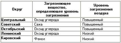 В ходе мониторинга метеорологи проводят отбор воздуха и определение содержания в них 25 вредных веществ. В целом по городу уровень загрязнения воздуха в январе признан повышенным. Воздух города более всего загрязнен оксидом углерода, сажей и фенолом. Зарегистрированы единичные случаи превышения ПДК оксида углерода в Центральном и Октябрьском округах, сажи - в Советском округе.