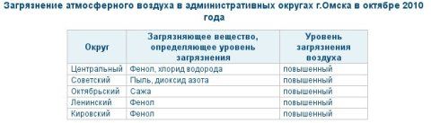 В октябре 2010 года воздух Омска более всего был загрязнен фенолом, хлоридом водорода, диоксидом азота, сажей и пылью. Зарегистрированы единичные случаи превышения оксида углерода в Советском и Октябрьском округах, хлорида водорода – в Центральном и Октябрьском. В последнем еще и высокая концентрация сажи. В Советском округе превышен уровень пыли и диоксида азота. Существенно возрос уровень фенола сразу в трех округах - Центральном, Ленинском и Кировском округах.