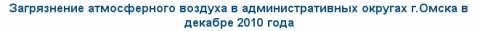 В декабре 2010 года экология Омска улучшилась. В четырех районах города установился низкий уровень загрязнения атмосферы. Ухудшение отмечено только в Ленинском округе. Основными "загрязнителями" стали оксид и диоксид азота, оксид углерода и формальдегид.
