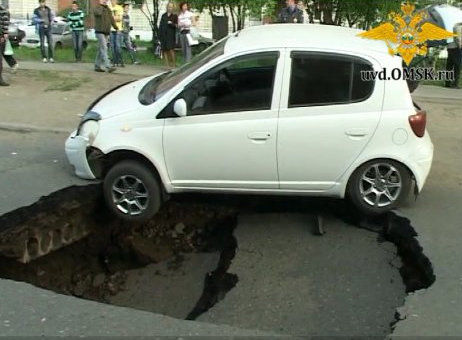 В Советском округе Омска во время движения машин по улице 22 Апреля обрушилась дорога. В яму глубиной 1,5 метра двумя колесами провалился проезжавший мимо автомобиль. Вчера вечером, в 19:45, в Омске автомобиль TOYOTA VITZ, ехавший по дороге на улице 22 Апреля, едва не провалился под землю. С левой стороны от него прямо на проезжей части начал рушиться асфальт, образовалась огромная яма. На место происшествия вызвали полицию. Сотрудники патрульно-постовой службы оцепили территорию, а экипажи ДПС ГИБДД организовали движение машин в объезд опасного участка дороги. По предварительным данным пресс-службы УМВД России по Омской области, яма площадью 2x2 метра и глубиной 1,5 метра образовалась из-за повреждения проходящего под проезжей частью трубопровода, в результате чего был подмыт грунт. В момент обрушения левые колеса проезжавшей TOYOTA попали в правый край провала. Поврежден передний бампер. 27-летний водитель автомобиля и его супруга не пострадали. В итоге машину эвакуировали, а место провала засыпали песком и щебнем. В 22:45 движение по улице 22 Апреля по одной полосе открыли. Сейчас место провала огорожено дорожными знаками. ОГИБДД УМВД России по Омску обязало городскую муниципальную компанию, в ведении которой находятся тепловые сети, восстановить асфальт.