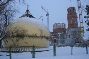 В Омске на площадке воссоздания Успенского кафедрального собора ведётся очередной и весьма сложный с технологической точки зрения этап строительства. Выполнен подъем опалубки под центральный свод храма. Вес конструкции - более 30 тонн.