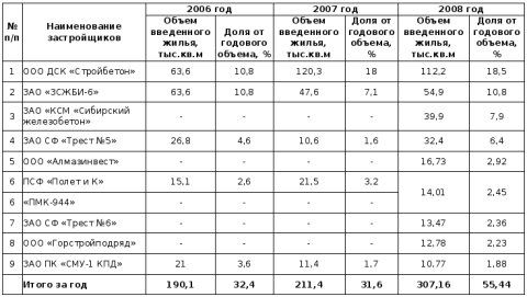 ЗАО "Завод сборного железобетона №6" за 2008 год ввело 54,9 тысячи квадратных метров жилья (10,8%), ЗАО "КСМ "Сибирский железобетон" - 39,9 тысячи квадратных метров жилья (7,9%), а ЗАО "Строительная фирма "Трест №5" - 32,4 тысячи квадратных метров (6,4%).