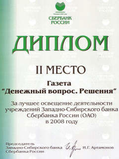 Сбербанк подвел итоги конкурса среди СМИ Омской и Тюменской областей. Газета "Денежный вопрос. Решения" награждена дипломом за лучшее освещение деятельности Западно-Сибирского банка СБ России.
