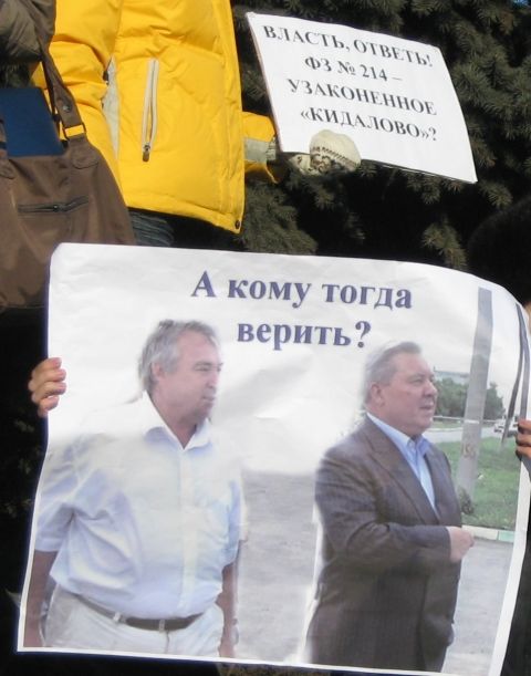 Не надеясь уже на застройщиков, в своих лозунгах пикетчики обращались в основном к властям с требованием вмешаться в ситуацию: "Президент, наведи порядок в Омске!", "А кому тогда верить?", "Почему "спят" законы? Где контроль?", "Власть, ответь: ФЗ №214 - узаконенное "кидалово"?".