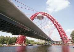Вантовый мост в районе Серебряного бора, спроектированный авторским коллективом НПО "Мостовик", представляет собой сложную инженерную конструкцию. Гибкая опора в виде арочного пилона, двухвеерное расположение вант, S-образная проезжая часть, коробчатый стрингер, необходимость высокоточного изготовления сложных металлоконструкций - вот неполный список его особенностей. Помимо исполнения проекта, объединение изготовило 17 тысяч тонн высокоточных элементов арки и проезжей части моста - "по бескондукторной технологии на базе трехмерного электронного моделирования на всех этапах производства, включая трехмерное лазерное сканирование на стадии сборки". Мост оказался крупногабаритным, и поэтому разделительную полосу применили для каждого направления движения - 4 полосы в каждую сторону.