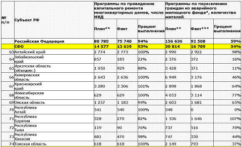 Фонд содействия реформированию ЖКХ подвел предварительные итоги реализации адресных программ по проведению капитального ремонта многоквартирных домов и переселению граждан из аварийного жилищного фонда. Омская область названа в числе регионов с низким показателем по программе переселения граждан из аварийного жилья - 65%. Впрочем, такие же результаты в соседних Новосибирской (77%), Томской (37%), Кемеровской (46%) областях, Красноярском крае (64%) и еще 30 регионах страны. Да и среднероссийский результат ниже омского - 59%. Среди сибирских регионов план выполнен только в Бурятии - 107%.