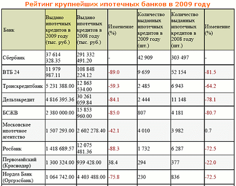 Из банков, занимающих лидирующие позиции, лишь Сбербанк закончил год без потерь. У ВТБ 24 объем выданных кредитов упал на 89%, а у "Транскредитбанка" - на 59,3%. Согласно рейтингу крупнейших ипотечных банков, который опубликован РБК, в 2009 году объемы выданных кредитов у подавляющего большинства банков снизились более чем на 50%, у некоторых участников рейтинга снижение составило и вовсе 100%.