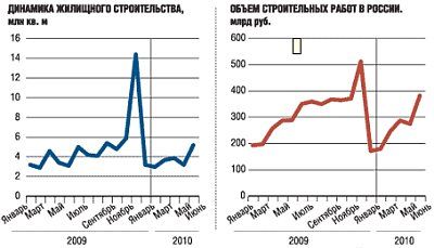 Согласно данным Росстата, в июле впервые за полтора года объем работ в строительном секторе продемонстрировал позитивную динамику, прибавив по сравнению с июнем 2009 года 3% и достиг 379,9 миллиарда рублей, - пишет "РБК". Фактический объем построенного жилья за полугодие также увеличился: в июле ввели 5,1 миллиона квадратных метров жилья, что превышает показатель прошлого года на 3,7%. Совокупные цифры за полугодие составляют 21,5 миллиона "квадратов".
