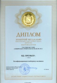 По итогам выставки издательский дом "Премьер" наградили золотой медалью международного выставочного центра "Интерсиб" за информационную поддержку мероприятия.