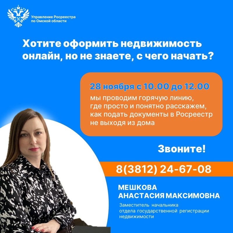 Завтра с 10:00 до 12:00 в Управлении Росреестра по Омской области будет организована горячая линия по вопросам предоставления ведомством в электронном виде государственных услуг по регистрации права и постановке на кадастровый учет.