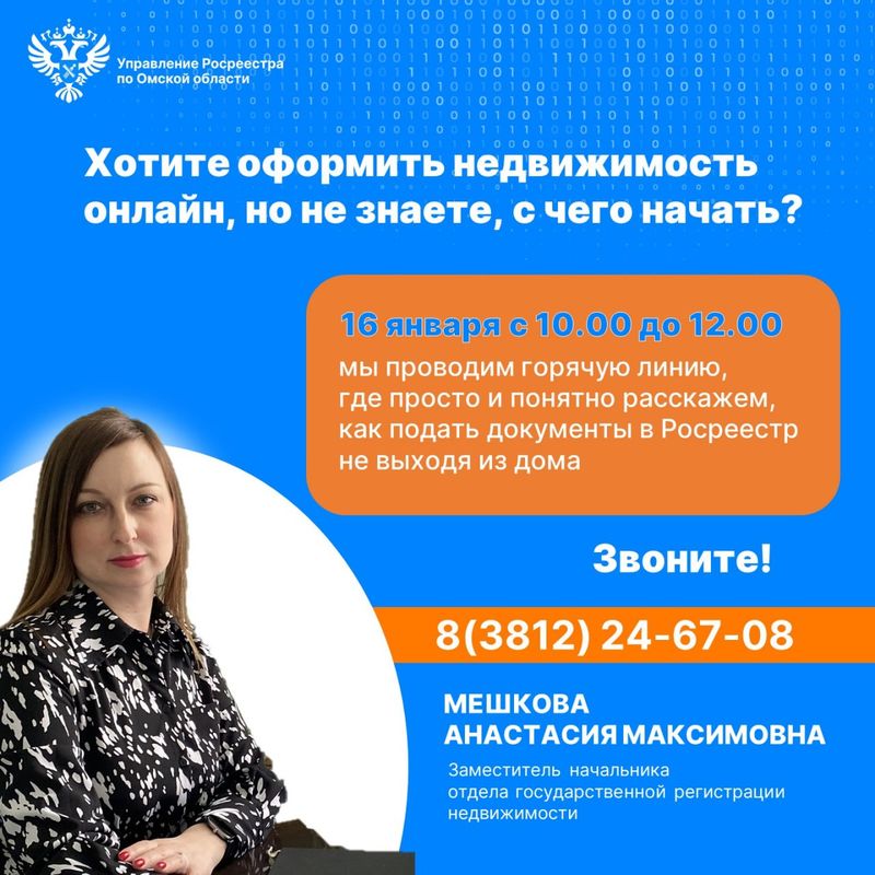Заместитель начальника отдела государственной регистрации недвижимости Управления Росреестра по омской области Анастасия Мешкова даст консультации по вопросам предоставления ведомством в электронном виде госуслуг по регистрации права и постановке на кадастровый учет.