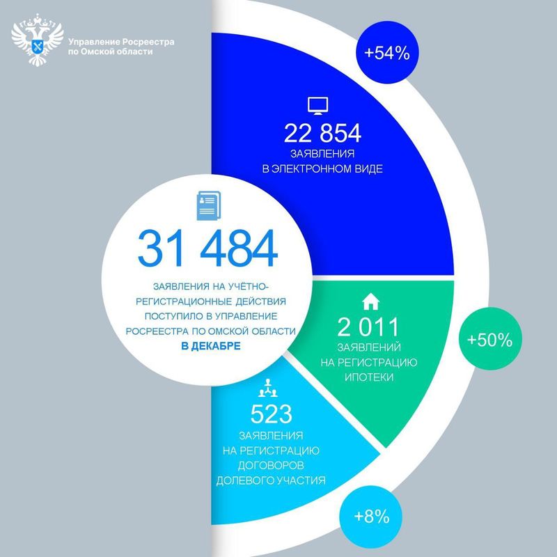 В декабре 2025 года в Управление Росреестра по Омской области от жителей региона поступило 31 484 заявления на проведение учетно-регистрационных действий в отношении объектов недвижимости, что на 41 % больше, чем месяц назад (ноябрь 2025 – 22 382) и на 2 % больше, чем год назад (декабрь 2024 – 30 800).