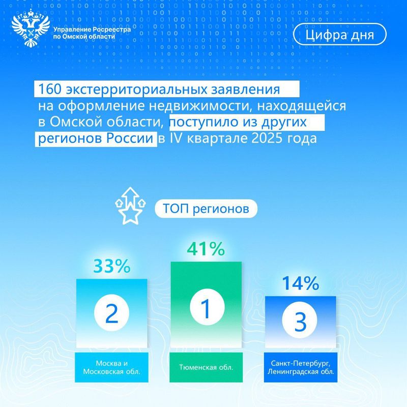 Управлением Росреестра по Омской области с октября по декабрь 2025 года всего было обработано 344 экстерриториальных заявления о дистанционном проведении государственной регистрации прав и кадастрового учета недвижимости, из которых 184 поступило от омичей и 160 – от иногородних покупателей.