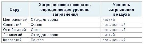 В целом по городу в феврале 2011 года уровень загрязнения воздуха был повышенным за счет загрязнения бензолом, оксидом углерода, сажей и фенолом. Зарегистрированы единичные случаи превышения предельно допустимой концентрации оксида углерода и сажи в Октябрьском округе, фенола – в Советском, а бензола – в Кировском округе.