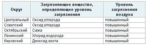 В целом по городу в марте 2011 года уровень загрязнения воздуха был повышенным за счет диоксида азота, оксида углерода, сажи и хлорида водорода. Зарегистрированы единичные случаи превышения предельно допустимой концентрации диоксида азота в Кировском округе, оксида углерода - в Центральном и Советском округах, сажи - в Октябрьском, хлорида водорода в - Ленинском.