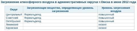 В целом по городу в июне 2012 года уровень загрязнения воздуха был повышенным за счет формальдегида. Также превышены предельно допустимые нормы оксида углерода, оксида азота и хлорида водорода.