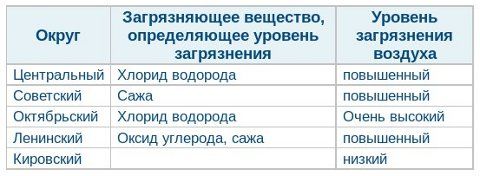 В целом по городу в январе 2013 года уровень загрязнения воздуха был очень высоким за счет содержания хлорида водорода (соляной кислоты). Этот "загрязнитель" значительно "подпортил" атмосферу Октябрьского округа. Повышенный уровень загрязнения остался в Центральном, Советском и Ленинском округах, где в числе ухудшающих экологическую обстановку веществ обнаружили хлорид водорода, сажа и оксид углерода. На Левобережье воздух стал чище.