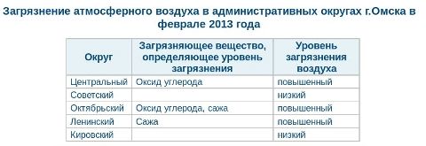 Уровень загрязнения воздуха в целом по городу в прошлом месяце был повышенным (по сравнению с показателями соответствующего периода прошлого года он не изменился). В частности, в Центральном и Октябрьском округах воздух был загрязнен оксидом углерода. В Октябрьском и в Ленинском округах в воздухе обнаружена сажа. Во всех трех округах уровень загрязнения воздуха в феврале повышен, зато в Кировском и Советском округах он был низким. За месяц воздух стал чище в Советском и Октябрьском округах.