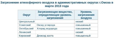 Как в предыдущем месяце и год назад, в марте 2013 года уровень загрязнения воздуха по городу в целом был повышенным. Таким он был в Октябрьском (содержался хлорид водорода), Кировском (диоксид азота) и Советском (оксид углерода) округах. При том что в последних двух округах в феврале его называли низким. Зато этой отметки в марте достигла степень загрязнения в Центральном и Ленинском округах, где в последний месяц зимы эксперты наблюдали повышенный уровень загрязнений.