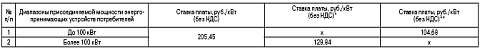 Ставка в размере 104,68 руб./кВт (без НДС) будет применяться при диапазоне мощности до 100 кВт на уровне напряжения ниже 35 кВ в отношении следующих заявителей:
